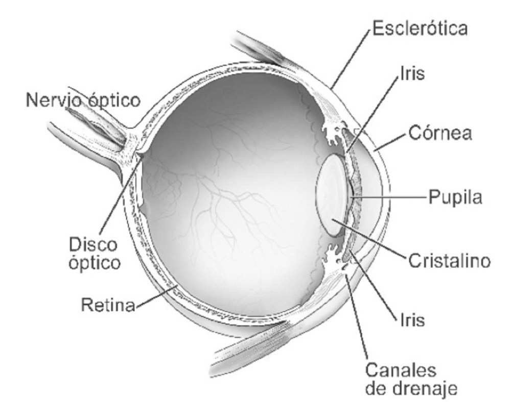 Para comprender el glaucoma,debemos fijarnos en las partes del ojo: la esclerótica es la capa blanca que sirve para protegerlo con una parte transparente llamada córnea que permite que la luz ingrese, luego está el iris que es su parte coloreada y que se contrae y dilata para regular la cantidad de luz que ingresa; esta luz atraviesa la pupila y llega al cristalino que la enfoca en la retina, en la parte posterior del ojo y es allí es donde tenemos millones de fibras nerviosas que son las encargadas de transmitir las imágenes al cerebro por medio del nervio óptico.