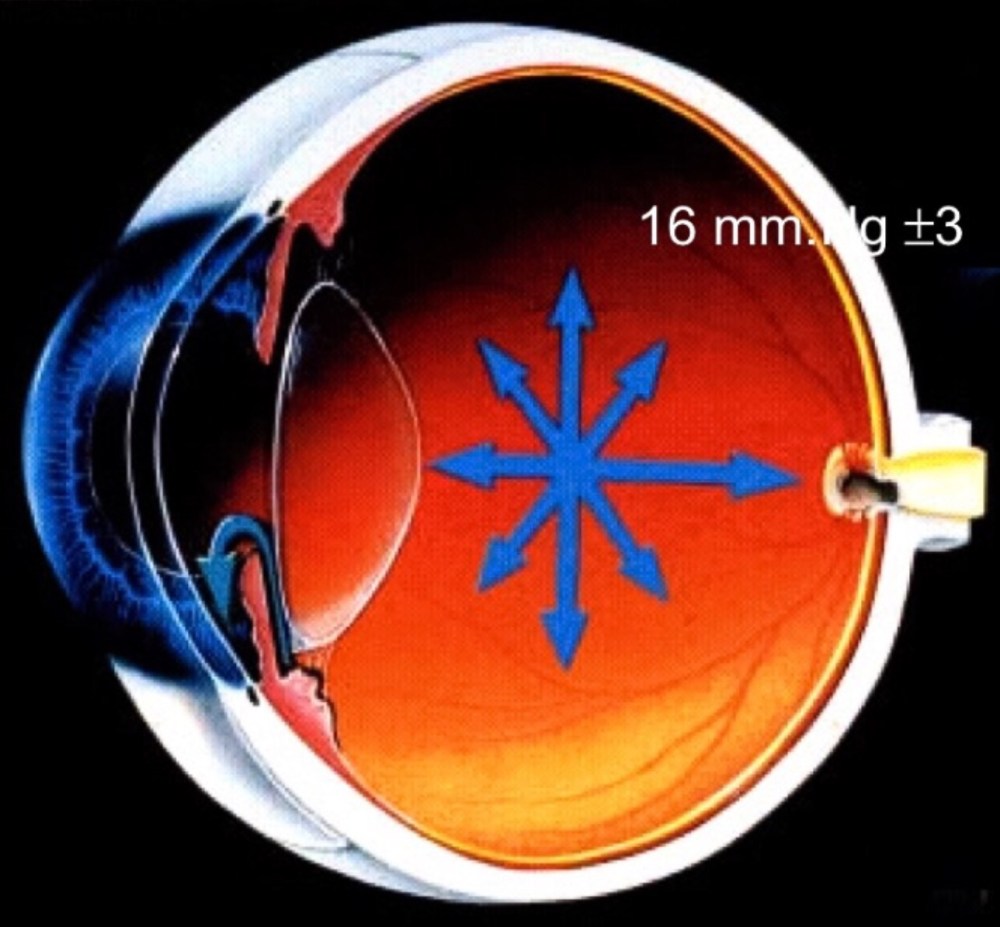 E igual que en un balón o un neumático, el aire a presión de su interior «empuja” sus paredes para mantener su forma esférica , en el ojo ocurre una cosa parecida, y son sus líquidos intraoculares los que también “empujan sus cubiertas» para darle su forma esférica. Normalmente nuestra presión ocular oscila entre los 16 y los 18 mm.Hg y la misma está regida bajo un ritmo circadiano, observándose que aumenta por la mañana (7 a.m.) y disminuye por la tarde (5 p.m.) con variaciones del orden de los 5 mm.Hg en 24 horas.