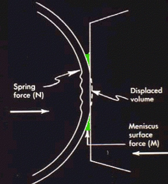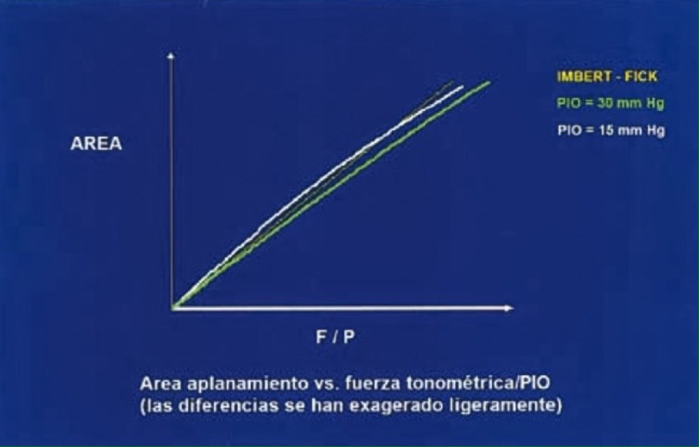 pero para poder aplicar este principio a la determinación de la PIO hay que tener presente que el ojo humano no es una esfera ideal, que no está seco y que el menisco lagrimal disminuye el valor medido de PIO por tensión superficial,; además la córnea tiene un espesor medio de aproximadamente 0,5 mm con su propia elasticidad y rigidez. Es decir era un principio empírico no se ajustaba totalmente a la realidad y solo era válido para un rango bajo de valores de A y de P/F