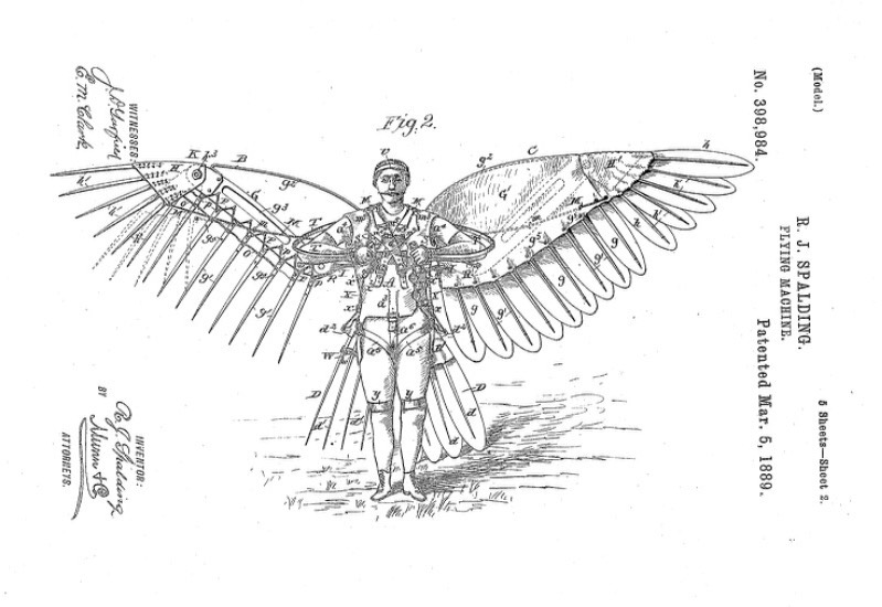 Pero Reuben Spalding era más imaginativo y el 5 de Marzo 1889 patentó su «Flying Machine‘ (Patente No 398984 ). En aquella patente Spalding nos mostraba un traje de pájaro que usaba un globo para levantarlo. Su máquina voladora llevaba una chaqueta de cuero adaptada al cuerpo del aeronauta por correas que circundaban sus piernas de modo que proporcionasen una unión importante y sustancial de las alas
