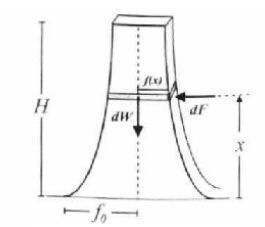 La forma que tiene es la de un sólido isotensional cuya mejor propiedad es la de que cada una de sus secciones está sometida a la misma tensión (el peso aumenta en la misma medida que aumenta su sección). Los calculo son complejos porque al final nos encontramos con una ecuación del borde de dicho sólido que deriva en una función exponencial.
