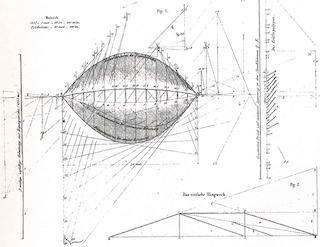 La forma que tiene es la de un sólido isotensional cuya mejor propiedad es la de que cada una de sus secciones está sometida a la misma tensión (el peso aumenta en la misma medida que aumenta su sección). Los calculo son complejos porque al final nos encontramos con una ecuación del borde de dicho sólido que deriva en una función exponencial.