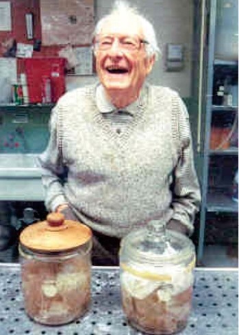 Thomas Harvey en 1994 con el cerebro de Einstein en un frasco de su cocina, 1994. Michael Brennan/Getty
