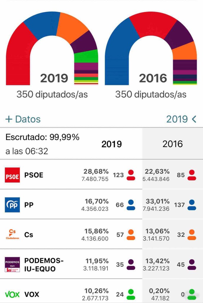 Según los datos del INE, había 36,8 millones de españoles con derecho a votar, con 1,15 millones de nuevos votantes, lo que suponía 400.000 votantes más que en las generales de 2016. De estos 36,8 millones entre las opciones “de izquierdas”, había más de una docena de listas, que sumaban 12,718 millones. Las opciones “de derechas” contando al conservadurismo tradicional nacionalista sumaban 12,356 millones .Es decir que entre ambos bloques ideológicos apenas había una separación de 362.000 votantes pero don Pedro Sánchez ha tenido la habilidad de destrozar el bloque de la derecha asustando a los votantes con que habría una “involución” si gobernara una coalición de PP, C’s y Vox a los que llegó a denominar la derecha “trifálica”apoyado por la sin par doña Susana Díaz que llego a llamar el “trifachito” a estos tres partidos y nos pedía ese «HAZ QUE PASE» y que su izquierda llegara al gobierno, algo que le ha funcionado a la perfección