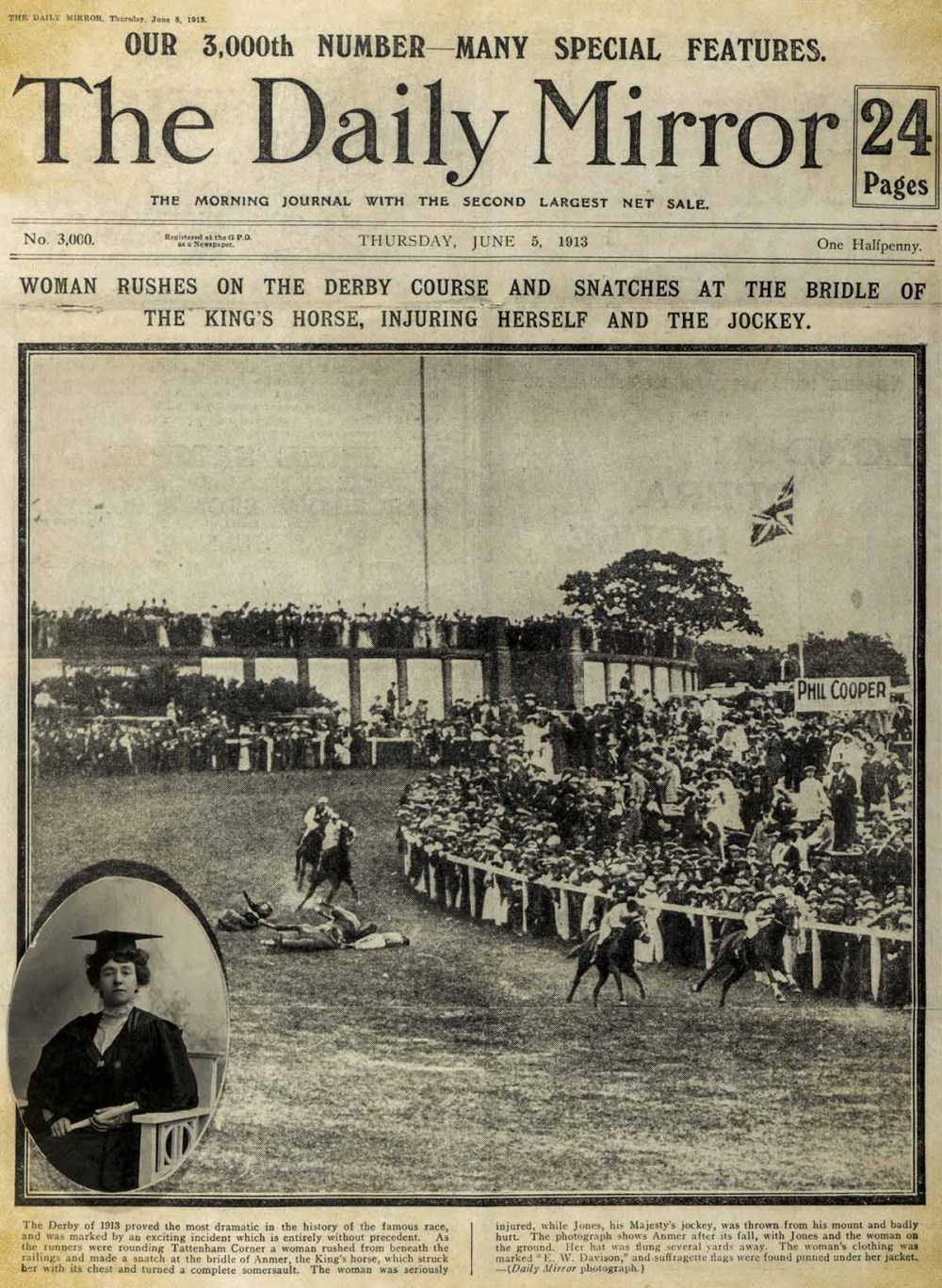 La guinda de la lucha la puso el 5 de junio de aquel mismo año otra joven sufragista inglesa llamada Emily Wilding Davison que en el Derby de Epsom intentó colgarle una cinta a favor de su causa al caballo Anmer, propiedad del rey JorgeV justo en el momento en que el animal empezaba su carrera.