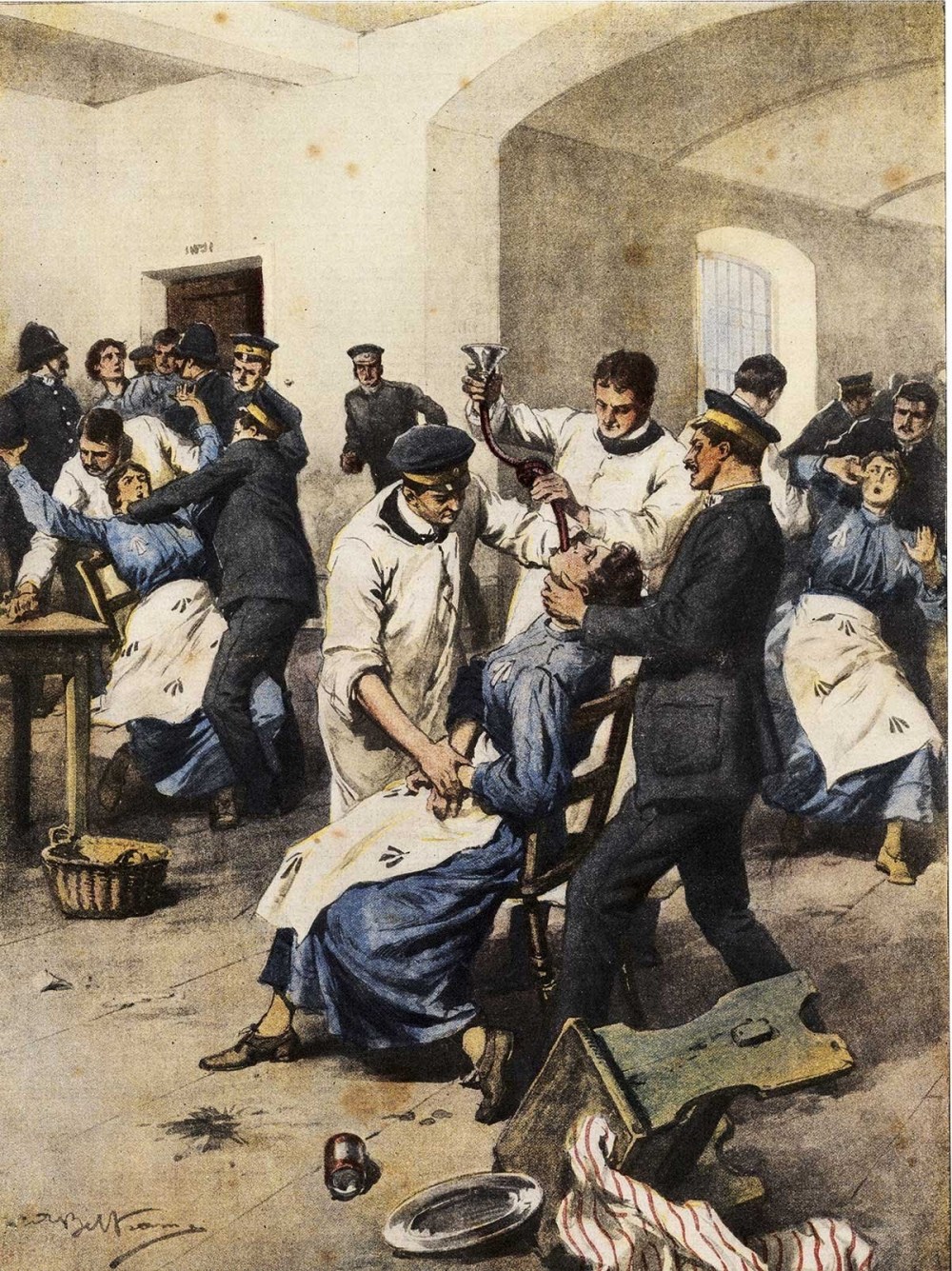 Las sufragistas son alimentadas a la fuerza en la cárcel. Litografía de Achille Beltrame, 1913. Foto: Look and learn / Bridgeman / Aci.