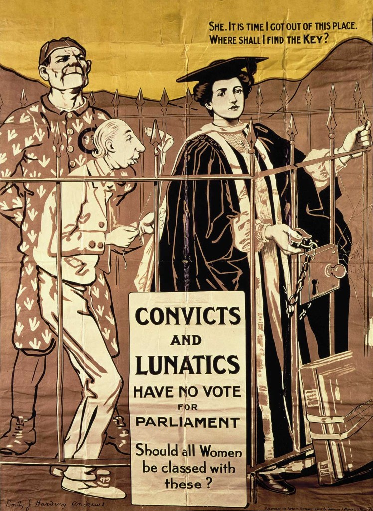 “Convictos y locos no pueden votar. ¿Las mujeres deben pertenecer a ese grupo?», se lee en este cartel sufragista de 1910