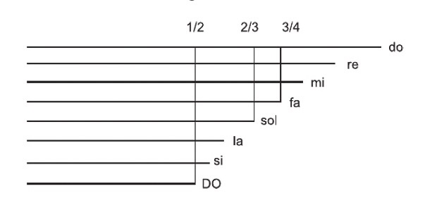 Tal y como vemos en la figura, anterior de esta manera se obtienen las primeras siete notas musicales que todos conocemos : do re mi fa sol la si, pero los compositores tenían que encontrar algún medio que indicara cómo «encajar» las voces y los sonidos de los instrumentos musicales y para eso necesitaban un sistema de notación que mostrara los valores relativos de las notas dentro de una única línea melódica. El sistema utilizado fue el de establecer la relación que existe entre la frecuencia de los distintos sonidos y a eso lo llamaron intervalo.