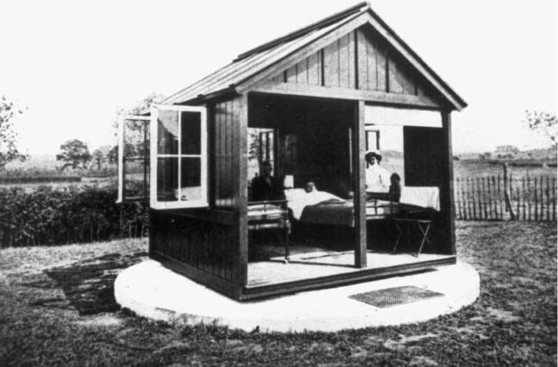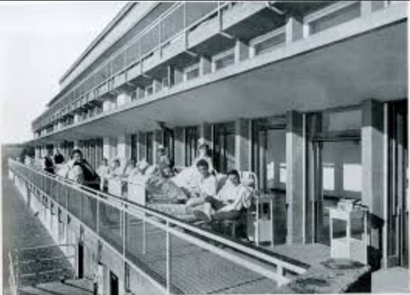 Así fue como surgió la terapia de las «curas por el Sol» y en la década de 1870 en los Alpes suizos se introdujo un nuevo tipo de edificio: «el sanatorio» con balcones y verandas orientados al sur para permitir a los pacientes poder tomar baños de sol