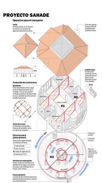 Esta casa empezó a ser construida en la ciudad de Córdoba (Argentina) en el año 1947 y tardó 4 años en completarse. El 10 de julio de 1951 comenzó a girar sobre su propio eje y tras terminarla Sahade decidió patentarla el 27 de octubre de 1952, con el número 86663 y el siguiente título: “Sr. Abdón Sahade, propietario, dueño e inventor del primer sistema giratorio aplicado a una casa”.