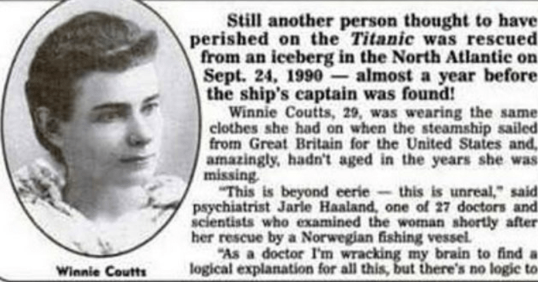 En el año 1990 un 24 de septiembre, un barco pesquero con bandera noruega descubrió en el Atlántico Norte a 340 kilómetros al suroeste de Islandia, a una joven, de unos 29 años de edad, sentada temblando en un iceberg. Dijo que su nombre era Winnie Cowts y preguntó por el resto de los pasajeros de Titanic. El capitán del pesquero, Carl-Yorgen la llevó a Oslo, donde las autoridades de Noruega pensaron que la mujer estaba loca. Lo único que les hizo dudar fue que, según comunicaron los oficiales de la Marina británica, en la lista de pasajeros de Titanic sí que había una Winnie Cowts y otro detalle muy peculiar: la joven iba vestida a la moda imperante a inicios del siglo XX. Se sabe que sobrevivió, y los registros indican que falleció en 1960 pero el análisis de su dactilograma coincidió con el de aquella pasajera de 1912 del Titanic.