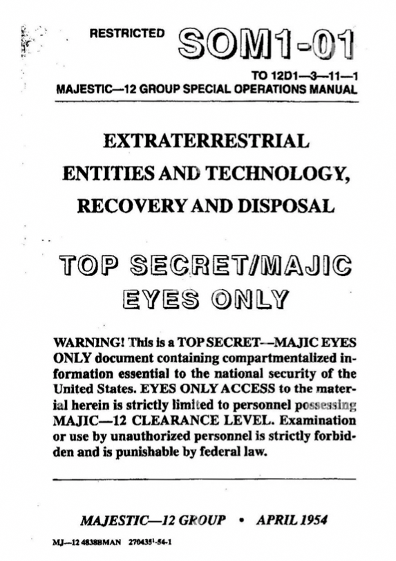 La imagen de portada es un facsímil de la página del título de un supuesto documento oficial que describía un “secreto oficial” de la política adoptada en abril de 1954 por los Estados Unidos en relación a las visitas de seres extraterrestres impulsada por el entonces presidente de esta nación en aquellos tiempos Dwight W. Eisenhower.