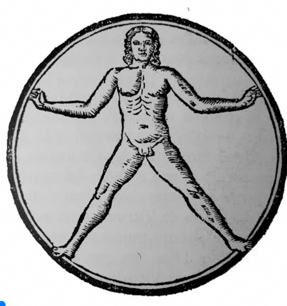 Así, las manos también tocaban los lados del cuadrado y los pies descansaban sobre la base de ambas figuras geométricas, y las proporciones seguían siendo las del ser humano ideal.