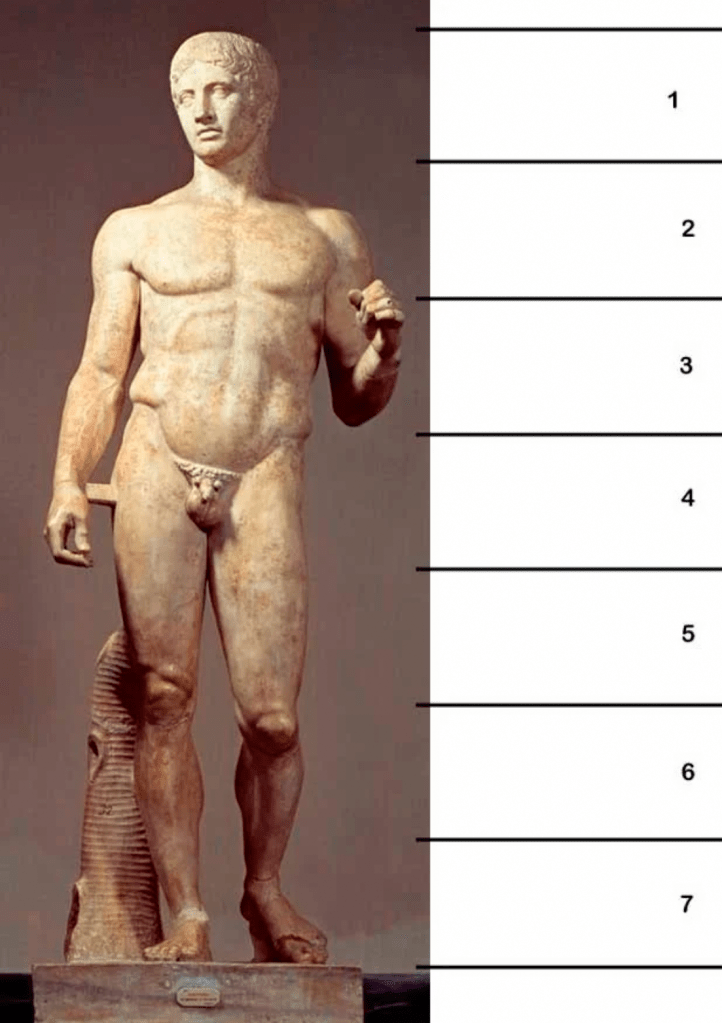 Policleto fue un escultor del siglo V a.C., en pleno período clásico griego, que se dedicó a elaborar un tratado sobre la proporción debida entre las partes del cuerpo humano. Aunque su tratado no nos ha llegado de manera directa, fue referido en la obra del físico Galeno (siglo I d.C) y, además, es reconocible en su legado artístico. De acuerdo con Policleto, el canon debe corresponderse con las siguientes medidas: