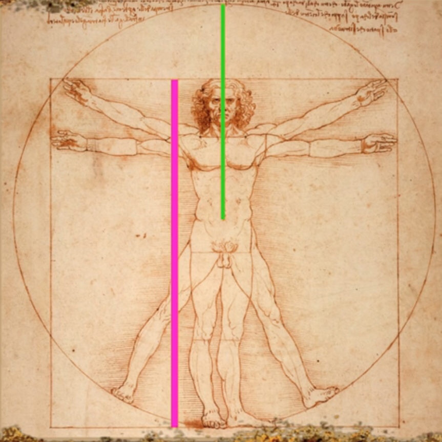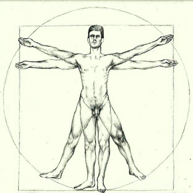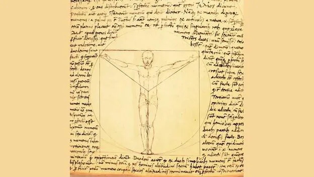 La base del boceto de Leonardo es la figura de un hombre cuya altura es igual al ancho de los brazos extendidos, en un cuadrado perfecto