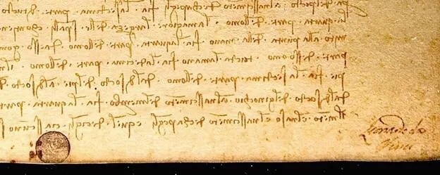 De esta manera la respuesta de Da Vinci al desafío de Vitruvio quedó plasmada con tinta marrón en su famoso dibujo en la que, además del gráfico, hay unos escritos que describen las proporciones del cuerpo y que explica las correcciones que hizo Da Vinci redactados en escritura especular, es decir, en dirección contraria, como si hubiese sido reflejada en un espejo: