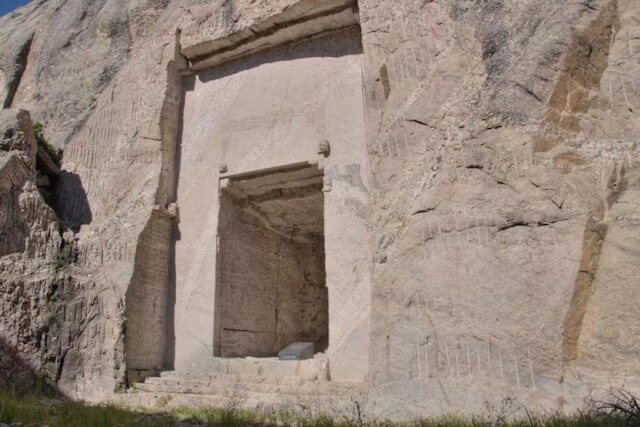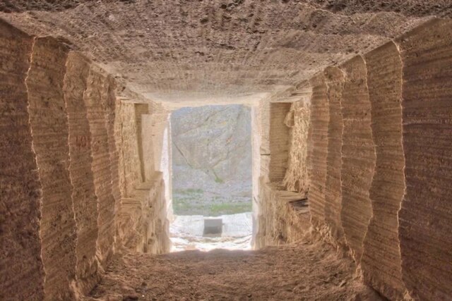 Esta puerta de entrada tiene 3,3 metros de ancho por 5,5 de alto y el hall principal alcanza los 22 metros de profundidad. Allí pueden verse las diferentes capas de rocas que componen la montaña de piedra