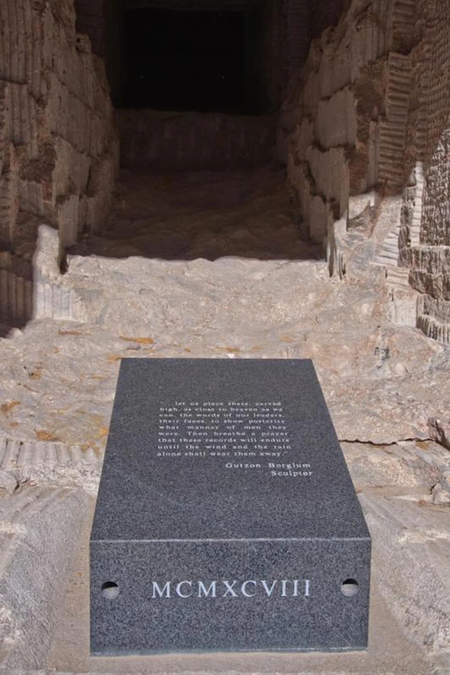 En 1998 a modo de homenaje, se decidió guardar en esta cámara secreta una caja de madera con varios documentos históricos junto a una biografía de Gutzon Borglum. La caja se introdujo a su vez en un recipiente de titanio, que quedó enterrado bajo una gran losa de granito a la entrada del «Hall of Records». Y sobre esa losa se grabaron unas palabras del escultor que resumen la esencia de su proyecto: «Coloquemos allí, talladas en lo alto, lo más cerca del cielo que podamos, las palabras de nuestros líderes, sus rostros, para mostrar la prosperidad que estos hombres nos dieron. Luego hagamos un rezo: que estas inscripciones aguante hastaque solamente el viento y la lluvia las lleven lejos»