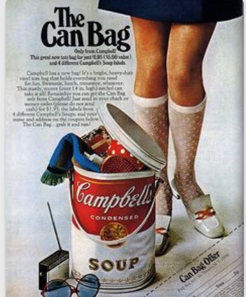 Aquí la idea es apelar al consumo juvenil con las piernas de una adolescente anunciando que esa «bolsa puede con todo» (sugerencia a irse lejos de casa. Recordemos que los jóvenes querían distanciarse cada vez mas de los adultos en aquellos tiempos )