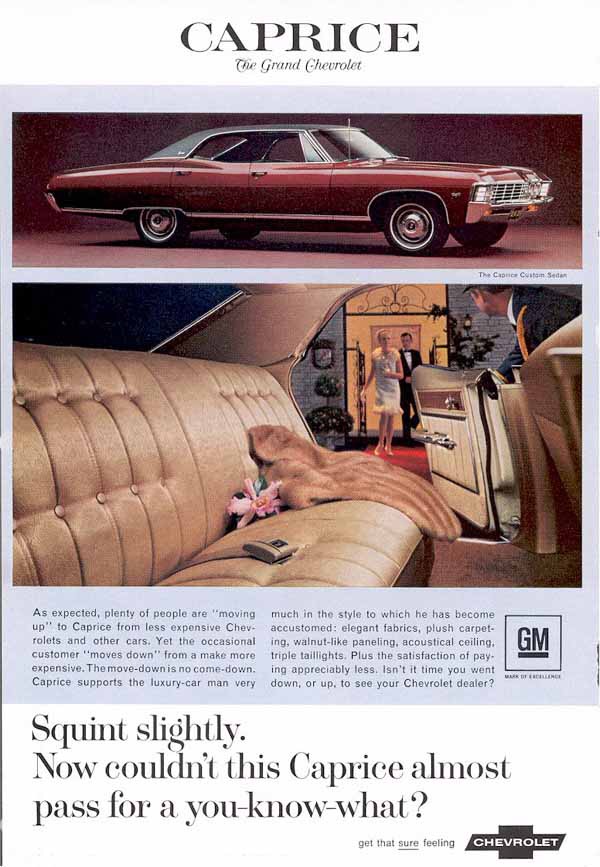 Aquí la idea predominante es la de jugar con el nombre de coche. Véase el párrafo final del anuncio.»Entrecierre los ojos ligeramente.¿No podría ser este Capricho casi pasar por algo que usted ya sabe?»