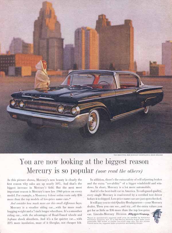 Empecemos por el automóvil. En los 60 el mercado automovilístico estaba caracterizado por la fabricación de automóviles de enorme tamaño y gran potencia. Eran habituales los motores V8 con 292 pulgadas cubicas (4.8 litros) y con potencias del orden de los 200 caballos. Se trataba de vehículos ostentosos con neumaticos de banda blanca, cuya única pega era la de tener un gran consumo de combustible pero ¿qué importaba eso en un mundo donde la «crisis del petróleo» estaba aún lejana y la gasolina se vendía a 19,90 centavos el galón? Por eso las «grandes ideas creativas» aplicadas a la publicidad de estos monstruos no se basaban precisamente en la economía sino en otros factores. Veamos algunas.