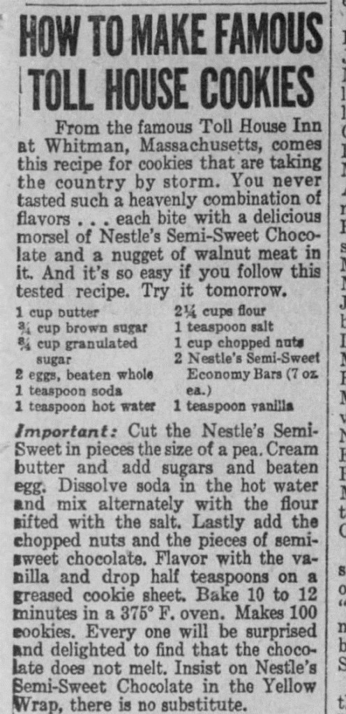 Una de las recetas favoritas de Ruth era una antigua receta de galletas llamada «Butter Drop Do» que se remontaba a la época colonial. Los ingredientes básicos consistía en mitad de azúcar blanca y mitad de azúcar morena con gotas de nuez pero Ruth pensó que podía hacer algunas variaciones interesantes y un día de 1938 con su asistente de cocina Sue Brides, empezó a experimentar con la masa de las galletas. Según la historia que nos cuenta Nestlé ella planeaba derretir chocolate en polvo para otorgar un sabor más dulce y un color amarronado a aquellas galletas pero cayó en la cuenta de que se había quedado sin chocolate en polvo y tuvo que idear otra alternativa.
