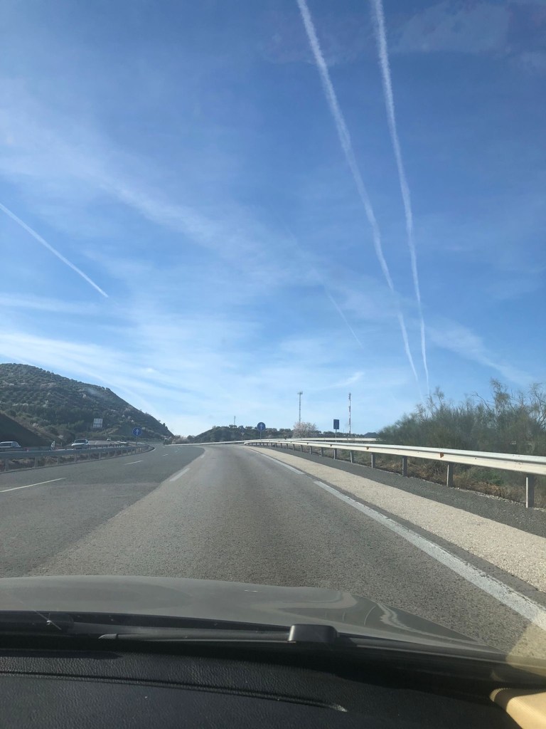 Tenemos sequía y hoy he salido de Jaén por la A-44 en dirección Granada. El cielo estaba muy nuboso pero a la altura de Campillo de Arenas empezó a ponerse de un radiante color azul. Mi mujer sacó la foto de un skyline de ese cielo surcado por estelas.