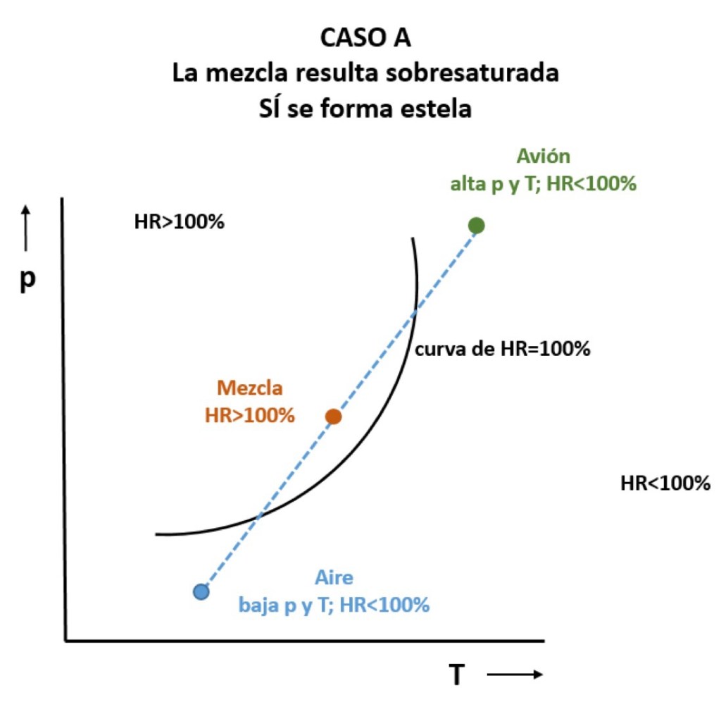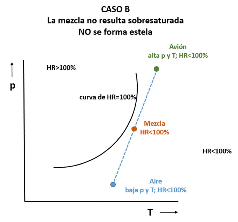 Es el caso A de la figura de arriba donde se mezcla una masa muy cálida y húmeda (avión) con un aire muy frío y húmedo. El estado final tiene HR>100% y lo sobrante se condensa y se forma una estela.
