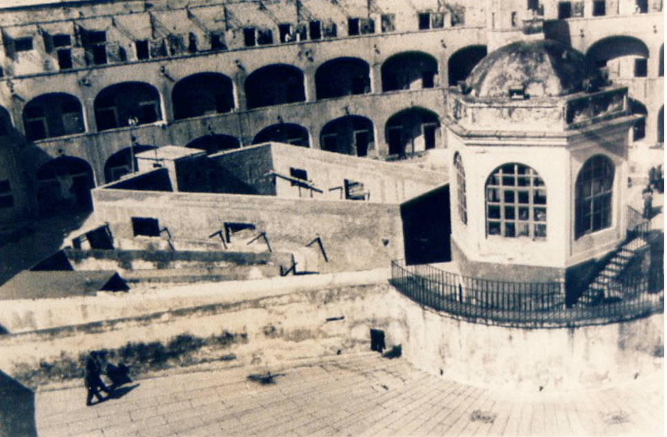 Las celdas miden 4,50 x 4,20 m. y tienen ventanas con boca de lobo, con doble rejilla, abovedadas con un arco externo y forman una serie de arcos típicos de la arquitectura árabe-mediterránea, en la planta baja y en la primera planta. Los tres pisos, similares a las gradas de un anfiteatro, dividían a la población reclusa en tres categorías: los más inquietos en la planta baja, más fácilmente controlables, y los otros en el primer piso y parte del segundo, donde varias celdas también servían como enfermería. En la planta baja, dos celdas sin ventanas se utilizaban para el castigo de los prisioneros más peligrosos y en el centro del patio interior se construyó una capilla con planta hexagonal, que con el diseño panóptico permitía a los presos asistir a las misas desde las mirillas de las puertas de sus celdas. En los dos extremos exteriores del hemiciclo,estaban los almacenes, la taberna, y las oficinas de la dirección.