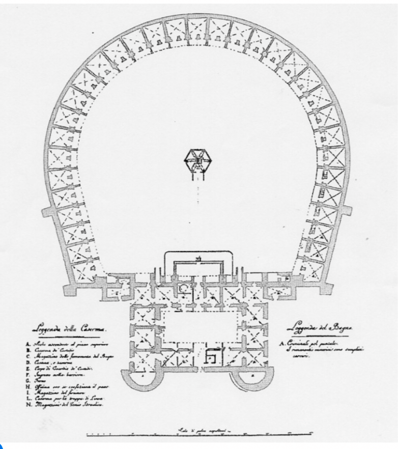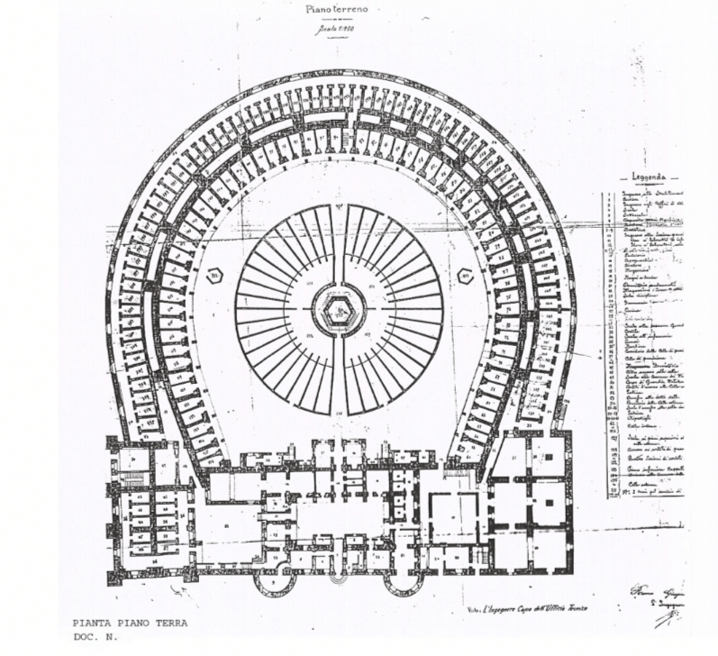 La estructura, una joya arquitectónica de rara originalidad, fue terminada en 1797, t su planta de herradura tenía un perímetro externo de 380 metros, cerrado por una parte delantera con pabellones cuadriláteros en los extremos, torres cilíndricas medianas y patio interior. A lo largo del perímetro interior de la arena de 207 metros había 99 celdas en tres pisos (el tercero, originalmente no planificado, fue encargado a Carpi en 1795) para una capacidad total de 378 reclusos (3-4 por celda), que luego se aumentaron a 600.