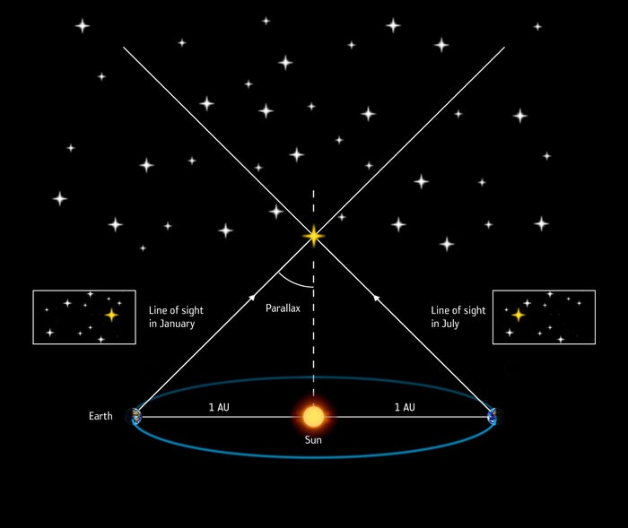 Con este método se puede determinar la distancia a un objeto lejano con sólo observarlo desde dos posiciones distintas. Por ejemplo, como la Tierra se desplaza en su órbita alrededor del Sol, si tomamos la medida de la estrella en una fecha determinada, por ejemplo, el 15 de enero y un tiempo después, por ejemplo, el 15 de julio, medimos cuánto se ha movido la misma con respecto al fondo, sabiendo las posiciones de la Tierra en esas fechas y el ángulo del paralaje podemos hacer este cálculo por trigonometría