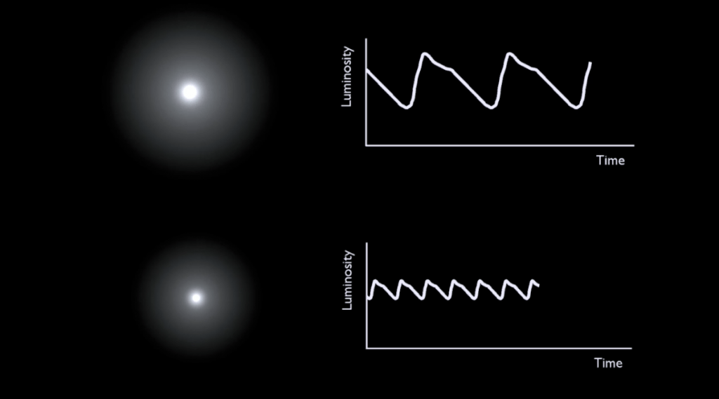 El problema era que Henrietta Leavitt no sabia cuánto brillaba intrínsecamente cada una de sus estrella cefeidas pero- eso si- tenía la seguridad de las mismas estaban todas aproximadamente a la misma distancia (la de la Pequeña Nube de Magallanes) por eso sus diferencias de brillo no podían deberse a diferencias de distancia y ella anotó que las más brillantes palpitaban más despacio. De ahí que tal vez se podría deducir su brillo a partir del ritmo de las pulsaciones estelares de aquellas estrellas.