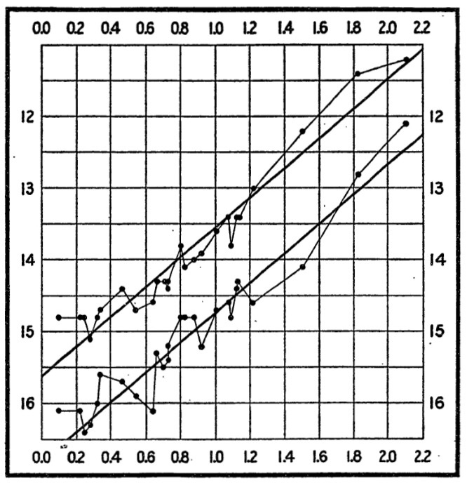 Y tal y como se explicaba en este trabajo: “Se puede dibujar fácilmente una línea recta entre cada una de las dos series de puntos correspondientes a máximos y mínimos, lo que demuestra que existe una relación simple entre el brillo de las variables Cefeidas y sus períodos.”