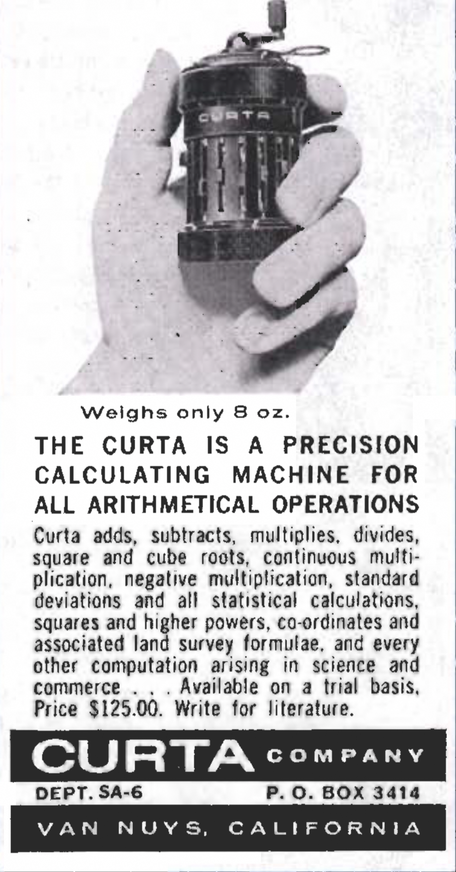 Anuncio de la calculadora CURTA en las páginas de Scientific American de la década de 1960 por un precio de 125 $.